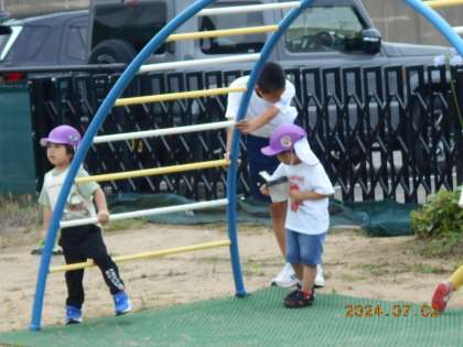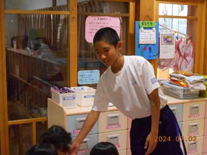 富山聖マリア保育園では、今日プール開きを迎え、着替えや外遊びの補助を行っていました。活動している生徒たちの多くは、こちらの保育園の卒園生たちなので、様子がよく分かっているようでした。