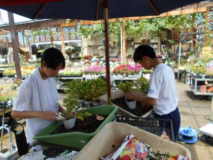 北山ナーセリーでは、水やりや植え替え、掃除などに取り組んでいました。最終日には自分の選んだ花を売るようで、選んだ花について調べ、ポップをつくり準備を進めていました。少しずつ作業にも慣れていて、上達しているようでした。