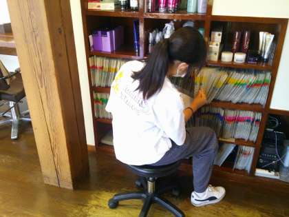 POCO-A-POCOでは、パーマに必要な仕事の準備をしていました。難しい作業も楽しみながら、頑張っていました。ファイルの整理やタオルを干す作業を丁寧に行い、一生懸命に取り組んでいました。