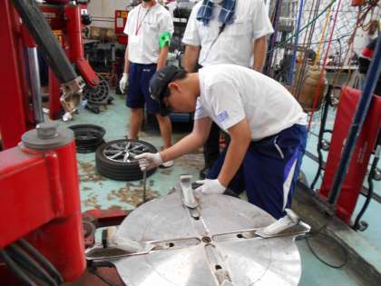 日産サティオ富山では、整備ピットでタイヤの着脱作業を一人ずつ行っていました。暑い中、積極的に頑張っていました。一週間の活動を生徒たちは楽しくできたようでした。