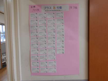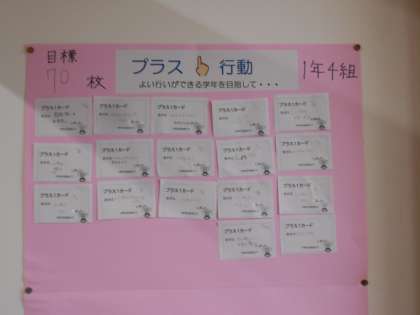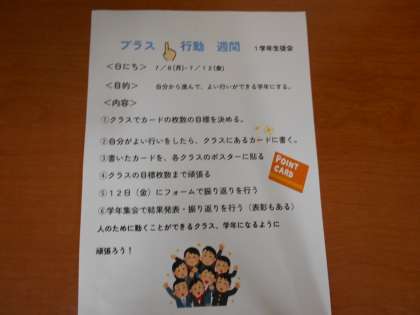 1学年では学年生徒会の活動として7月8日〜12日に「プラス1行動週間」を行っています。これは、自分から進んでよい行いができる学年を目指し、その日に行ったよい行いをカードに書きポスターに貼っていく活動です。