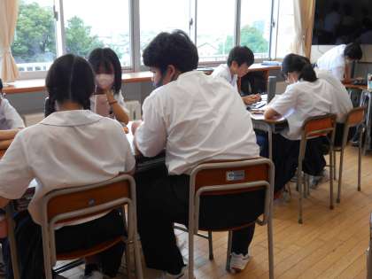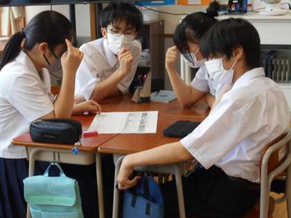 朝の南中タイムの時間に社会科の学び合いを行いました。本日は雨温図(年間の降水量と気温の変化を表した図)から気候名や特徴を答える問題でした。グループで知識を出し合い問題に取り組んでいました。