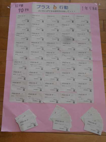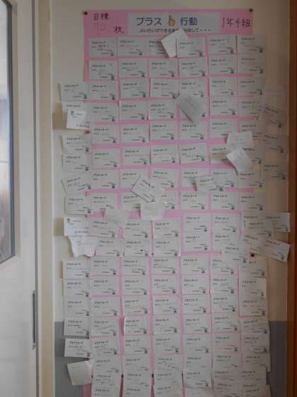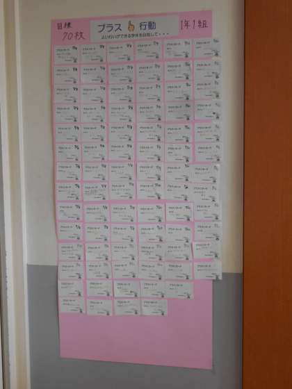 学年生徒会で行っている「プラス1行動週間」が最終日を迎えました。目標を上回る良い行いがカードに書かれ台紙に貼りきれなくなったクラスもあります。これからも気持ちのよい学年になるよう良い行いを続けていってほしいです。