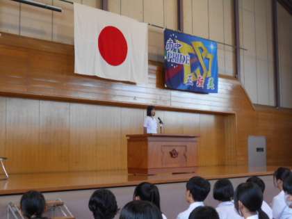 夏季休業中に県大会や昇段試験等で優秀な成績を収めた生徒の受賞報告会や3年生の意見発表の後、2学期の始業式を行いました。