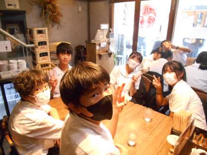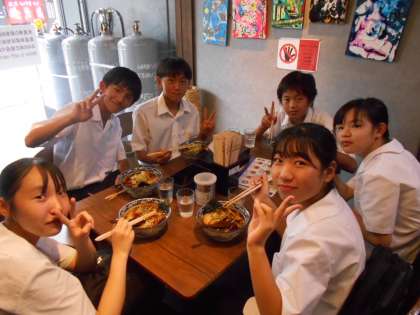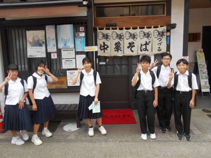 班別学習の様子、昼食に高山ラーメンを食べています。
