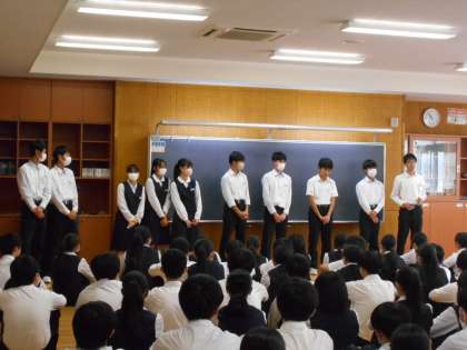 また、5日(土)に行われた県中学駅伝を振り返り、駅伝部の生徒から一言ずつ話をしてもらいました。