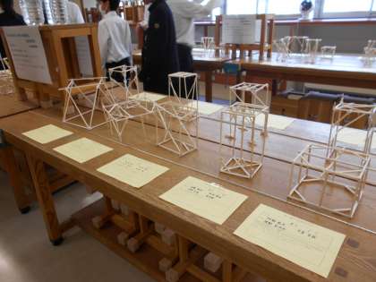 10月30日(水) 文化活動発表会 作品展示 公開日 2024/10/30 更新日 2024/10/30 南中NEWS これまでに授業で制作した作品や、夏休みの課題だった理科の自由研究が展示されていました。いろいろな工夫が見られました。 左:1学年 書写の作品 中:1学年技術科 割り箸で作った2Lのペットボトルを載せる台 右:1・2学年 理科の自由研究