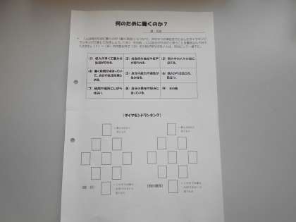 「何のために働くのか」について友達の意見を参考に考えを深めました。収入、やりがい、適性等、どれも大切なことです。いろいろなことを考えて職業を選択しなければならないことに気がついてくれればと思っています。