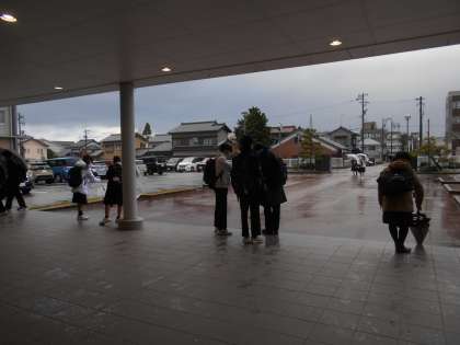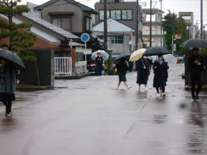 雨の朝です。生徒玄関に入る前に、傘に付いた雨滴を落としています。