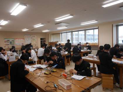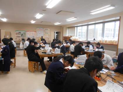 技術・家庭(技術分野)で、ランタンをつくっています。水を入れたペットボトルを置いて明かりを拡散できたり、ラジオも聞けたりと、防災グッズに最適なようです。ハンダ付けでの細かい作業に皆集中していました。