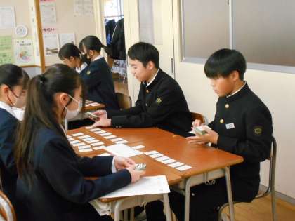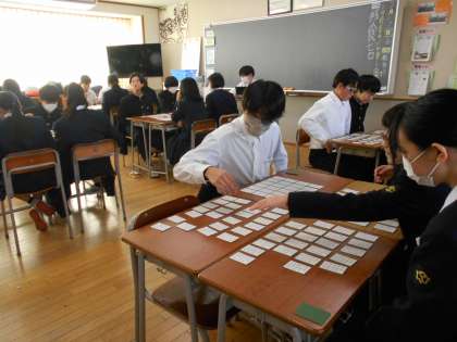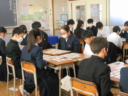 12月20日(金) 1学年百人一首練習会 公開日 2024/12/20 更新日 2024/12/20 1年生 5・6限に百人一首練習会を行いました。全校放送による指示で、学級ごとに4人班で対戦しました。楽しさの中にも落ち着いた雰囲気を感じました。 今日の成績順にクラス分けをし、来年1月中旬に百人一首大会を行う予定です。 写真は、準備の様子(左側)、対戦の様子(中央、右側)です。
