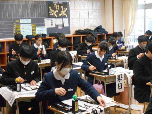 始業式の後、学級ごとに書き初めを行いました。今年の1年生は「日進月歩」という言葉を書きました。真剣に取り組む姿が見られました。