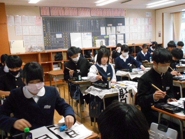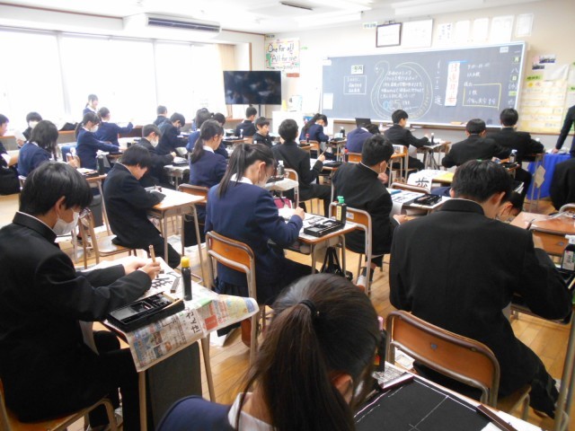 始業式の後、学級ごとに書き初めを行いました。今年の1年生は「日進月歩」という言葉を書きました。真剣に取り組む姿が見られました。
