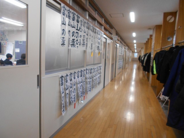 昨日行った書き初め大会の作品が廊下に掲示されています。