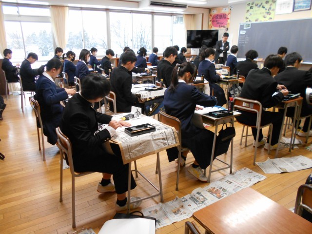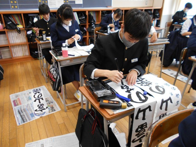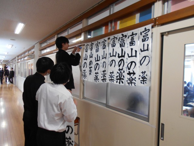 書き初め大会が行われました。2学年は「富山の薬」という言葉を書きました。集中して丁寧に取り組んでいました。1人1枚自信のあるものを選び、廊下に掲示していました。