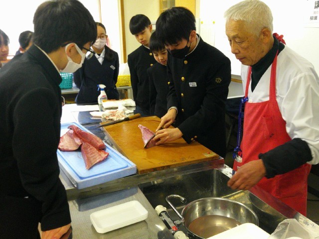 右 「調理師」の方から、寒ブリのさばき方を学んでいます。