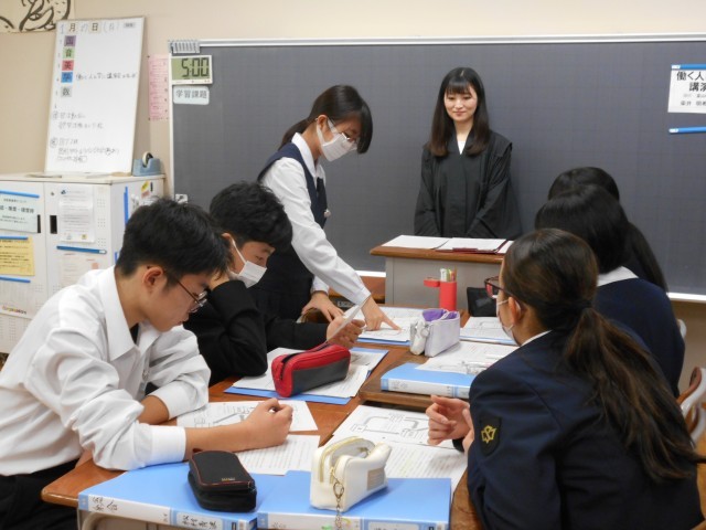 左 「裁判官」の方から、模擬裁判について学んでいます。