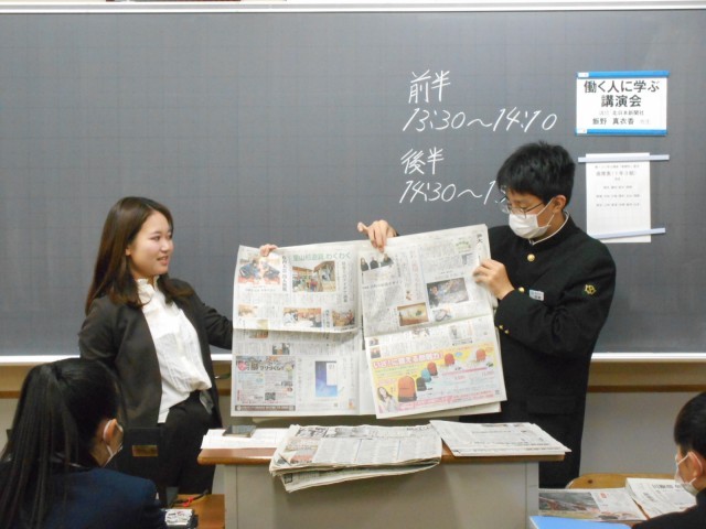右 「新聞記者」の方から、新聞作りについて学んでいます。