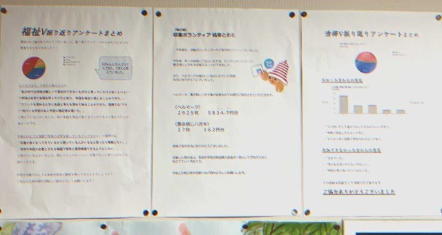 生徒玄関前に3大ボランティアの振り返りアンケート結果が掲示してあります。来年度の活動に生かしてほしいです!