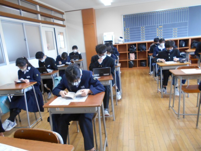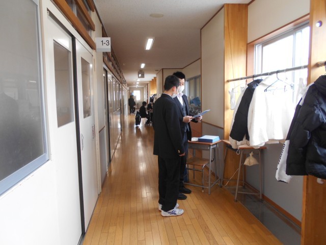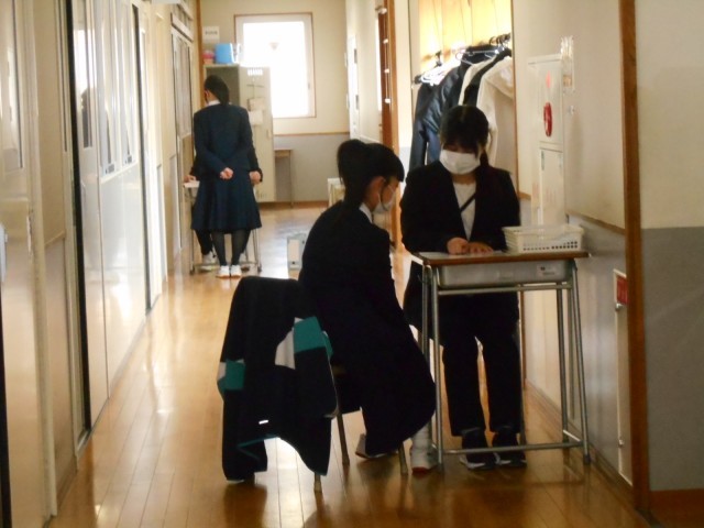 修了式の後、今年度最後の学級活動を行いました。一人一人に1年間の様子を確認しながら通知表を渡しました。教室にいる生徒たちは、静かに自習をすることができました。