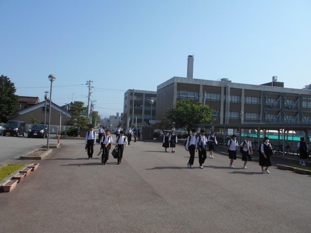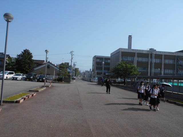 昨日に引き続き、今日も気温が上がりそうです。傘をさしたり水筒を肩にかけたりと、暑さ対策を強化して登校する生徒が多くなりました。運動会の団練習では、休憩や水分補給をこまめに行っていきます。