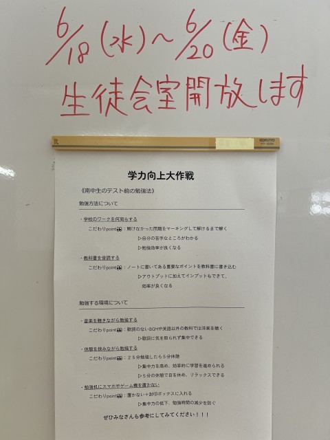 勉強法の紹介をまとめた「学力向上大作戦」の掲示物が玄関前にあります。水曜日から金曜日まで学習室の開放もあるので、ぜひ参加してみてください。