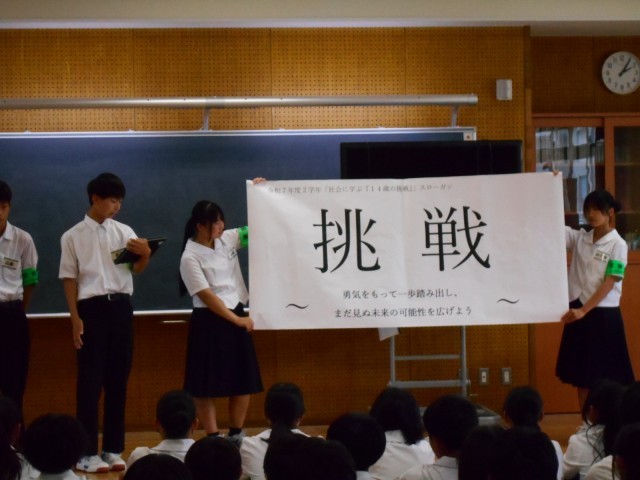 7日(月)から始まる『社会に学ぶ「14歳の挑戦」』のスローガンは「挑戦~勇気をもって一歩踏み出し、まだ見ぬ未来の可能性を広げよう~」です。5日間で各事業所で様々なことに挑戦し、次につなげる一歩を踏み出してくる決意を学年で共有しました。
