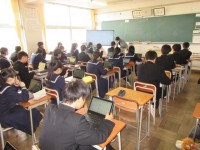 1年技術・家庭科(技術分野)では、情報の技術を学習しています。課題を解決できるような簡単なプログラムをつくっています。生徒たちは試行錯誤を繰り返しながら課題に挑戦していました。