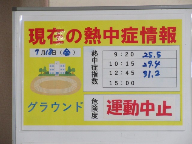 12時現在で、暑さ指数(WBGT)を測定したところ、グラウンドで31.2度を記録。運動中止の数値を超えたため、外の部活動は中止となりました。