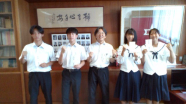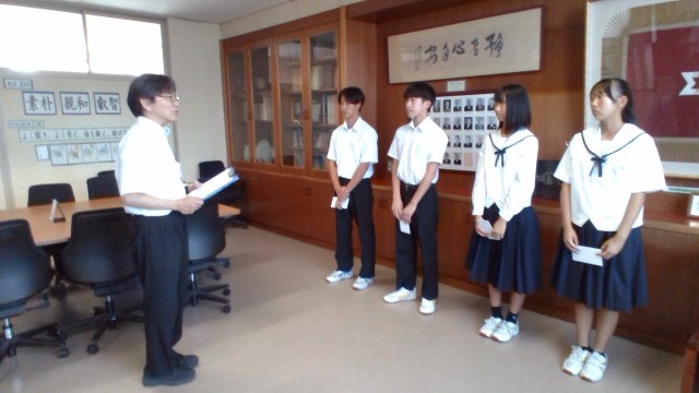 7月16日に続き、今日はソフトボール、サッカー、水球競技で上位大会に出場する部活動・地域クラブ生徒4名の生徒たちに激励金を授与しました。