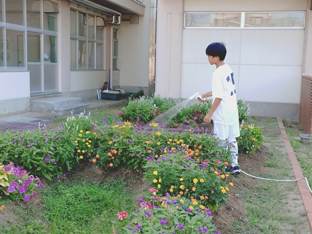 サッカー部が花壇の水やり当番をしていました。