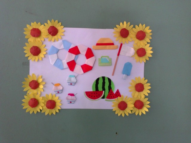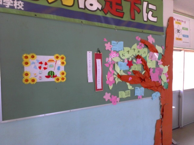 生徒玄関前の掲示板には、生徒が作った夏の掲示物が掲示してあります。