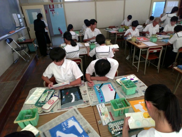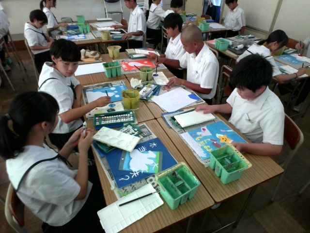 2年生の授業はポスター制作です。今日は、仕上げ(彩色)をしていました。完成が楽しみです。