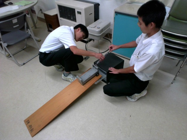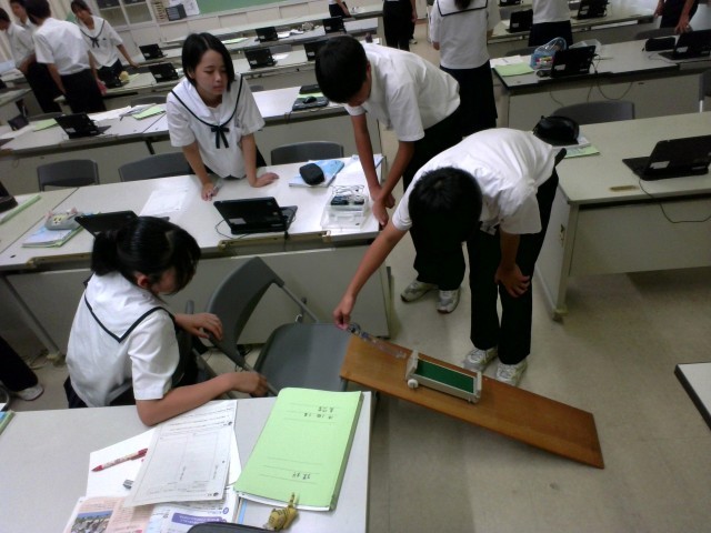 理科では、運動について学習しています。様々な角度の斜面で台車を走らせ、速さの違いを記録しています。生徒たちは、意欲的に実験に取り組んでいました。