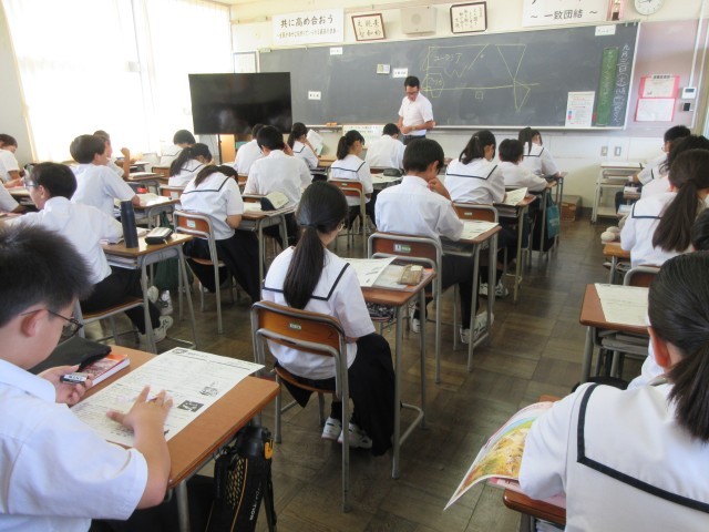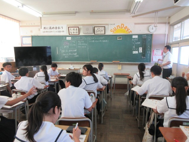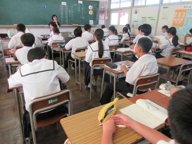 1組は数学の授業です。いろいろな式の作り方を勉強しています。2組は国語の授業です。夏休みの思い出について皆で話しています。3組は社会の授業です、夏休み明けテストをもう一度解き直しています。