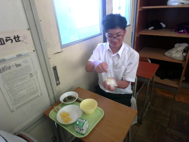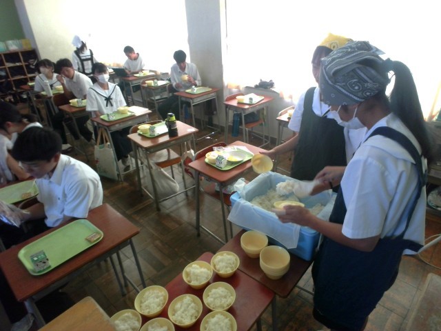 教室でおにぎりを作る生徒たちの様子です。
