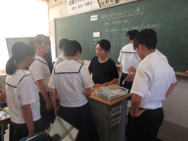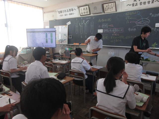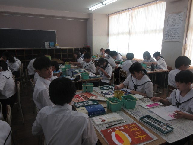 3限目、2年生の授業風景です。1組は英語。先生に多くの生徒が質問しに来ていました。2組は美術。「メッセージを伝えるポスター」をテーマに丁寧に色を塗っていました。3組は理科。葉の条件による水の吸水量を実験していました。