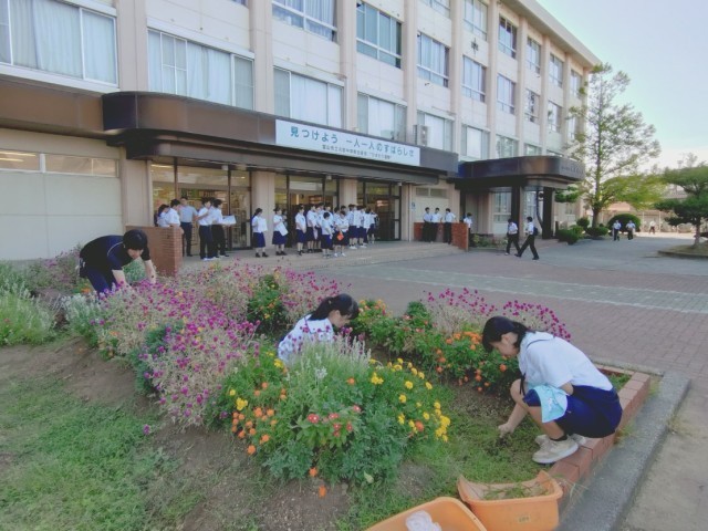 今朝も花壇の草むしりをしている生徒がいます。うれしく思っています。