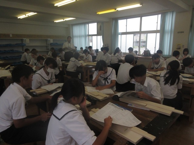 2組は技術。先生からけがきについての説明を真剣に聞いていました。