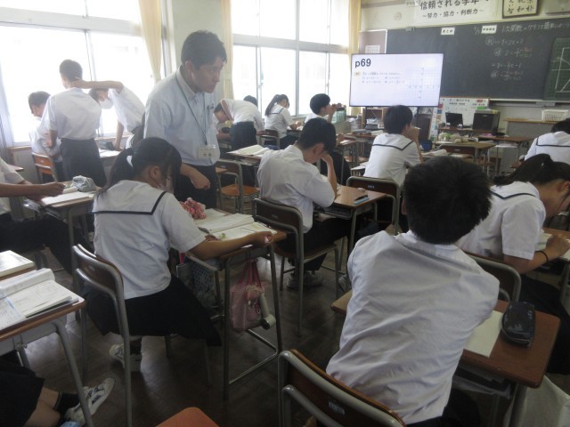 3組は数学。1次関数のグラフの書き方を生徒同士で話し合いながら考えていました。