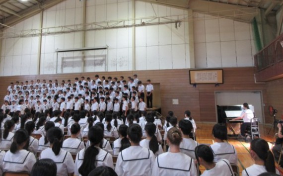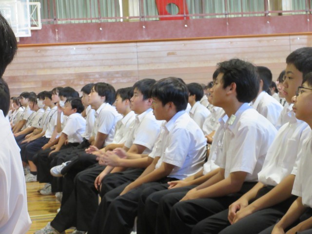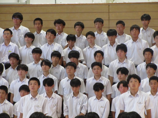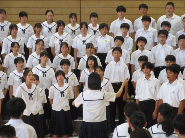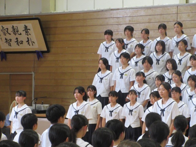 そして、最後に3年生全員による誓いの言葉の唱和、合唱。力強いそのまとまった声は、1、2年生や保護者の皆様の心に伝わり、その響きは、まさに「HEIWAの鐘」でした。