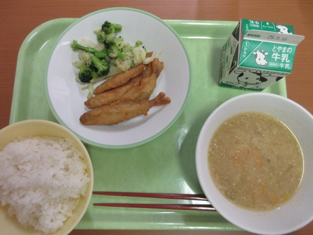 9月9日(火)今日の給食 公開日 2025/09/09 更新日 2025/09/09 給食 今日の献立は、ごはん、牛乳わかさぎのフリッターブロッコリーの和え物坦々春雨スープ です。わかさぎのフリッターは人気メニューの一つ。今日もカリカリと美味しく揚がっていました。