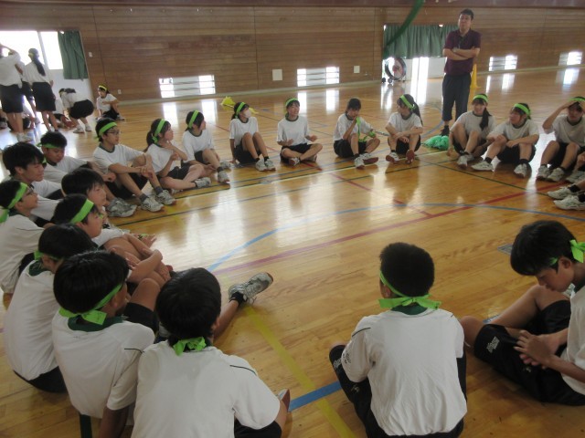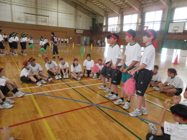 3限目、1学年種目の「暴走台風」の練習です。各団で集まり、どうやったら早くゴールできるか皆で案を出し合い、実際に練習で試しました。応援の声も大きく、本番さながらの熱気の中で練習が行われていました。