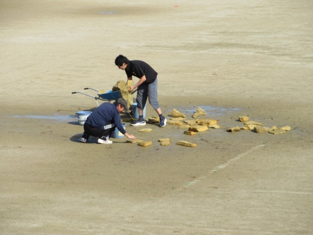 朝、生徒や教職員有志で行ったグラウンド整備は、4限目の団別練習をグラウンド中央で行うために、全体練習中も数人の先生たちで続けておりました。