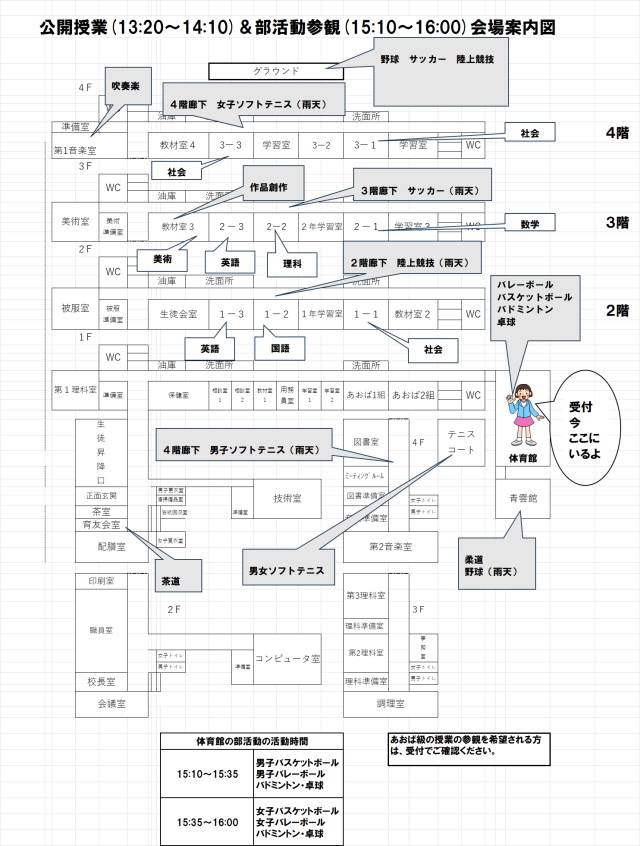 ※13:20以降にお越しの方は、体育館に受付名簿がありますので、記名してご参観ください。