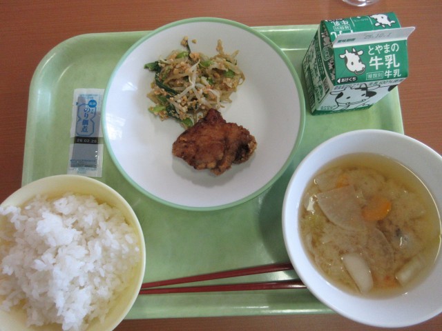 9月24日(水)今日の給食 公開日 2025/09/24 更新日 2025/09/24 給食 今日の献立は、ごはん、牛乳豚肉の香り揚げいり大豆和え、つみれ汁のり佃煮 です。豚肉の香り揚げがとてもおいしく人気でした。