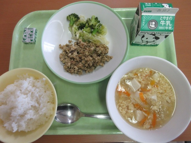 9月25日(木)今日の給食 公開日 2025/09/25 更新日 2025/09/25 給食 今日の献立は、ごはん、牛乳とやまのえごま入りガパオライスレモンサラダ、卵スープポケットチーズ です。ガパオライスがエスニックな感じで、とても美味しく、それに富山の特産が入っています。
