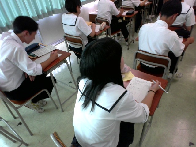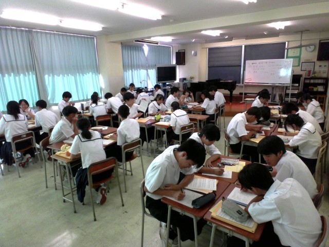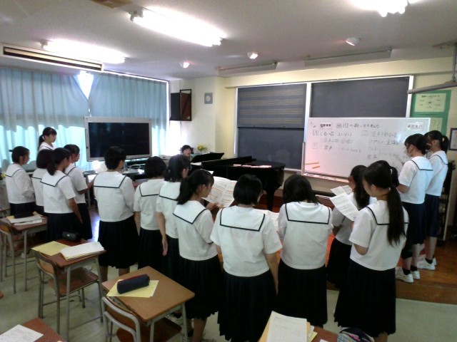 音楽科では、合唱コンクールに向けて合唱の学習しています。前半は生徒たちは曲を聞きながら、どのように歌えばよいかワークシートにまとめたり、グループで意見交換したりしていました。後半は、表現方法を工夫しながら実際に歌いました。