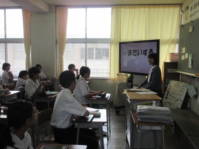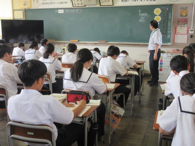 1年授業風景です。国語の授業では、いろいろな方言についてクイズをしています。 数学では方程式について復習をしています。
