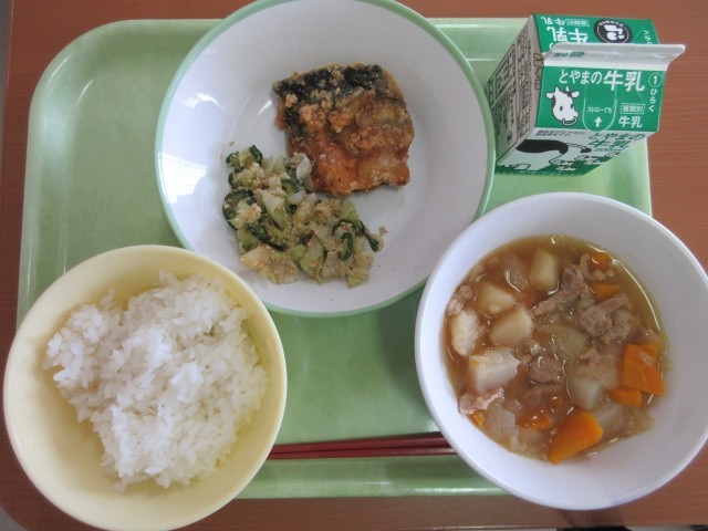 10月1日(水)今日の給食 公開日 2025/10/01 更新日 2025/10/01 給食 今日の献立は、ごはん、牛乳さばの竜田揚げ、ごま和え豚肉の炒め煮 です。炒め煮が温かくておいしかったです。いつの間にか、あたたかい食べ物がうれしく感じる季節になっていました。